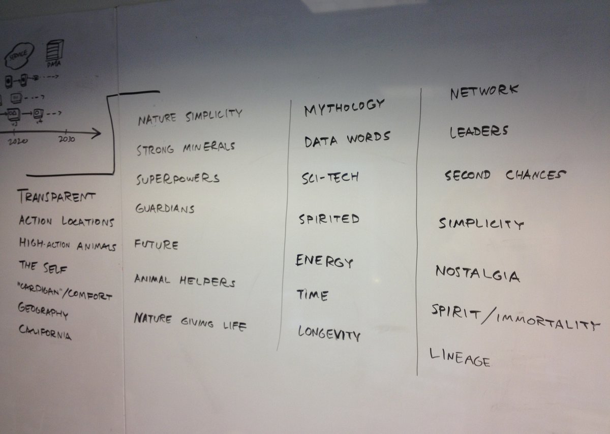 For the next 10 minutes, everybody had to come up with as many themes as they could—on their own. For 5 minutes after that, each person filtered their own list. At the end I wrote everybody’s picks on the board. We had about 30 themes ranging from “natural simplicity” to “strong minerals” to “nostalgia.”
