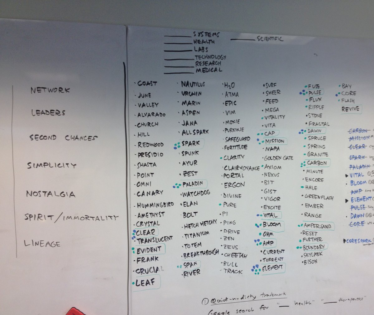 Was there a decent domain name available? Uday wanted a dot-com extension — no freaky dot-ly or dot-io for the doctor crowd. He also didn’t want to spend a bazillion dollars buying a domain name. In addition to the names, we considered a handful of acceptable suffixes: blanklabs.com, blankmedical.com, blankscience.com, etc. Four names survived, but some of the domains were better than others.